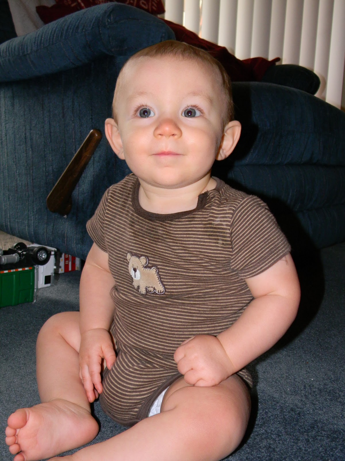 Brendan is definitely an independent little guy. He hates to be contained and is really only happy when he can crawl around the house. He is an expert crawler now and is getting into just about EVERYTHING! He pulls himself up on all the furniture, whether the item is stationary or not, and scoots along the furniture. He is trying so hard to clap and wave and is really almost there! He has 2 two teeth on the bottom and we think we might have caught something coming in on the top. He loves to eat and continues to cry while he is eating because mommy just cannot feed him fast enough! He has started some of his stage 3 foods and is liking them so far! His sleeping habits are getting a little better. He is only waking up 1-2 times at night instead of 3-4, plus, he is starting to find more comfort in his bed and sleep is becoming easier for us at night and during the day because he likes sleeping in his own bed! He continues to laugh hysterically at Liam and loves it when Liam includes him in his play!